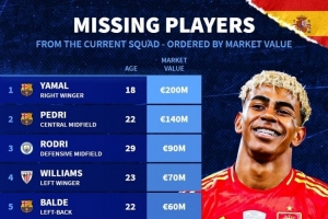 体育资讯11月16日讯 德国转会市场统计了无缘本期西班牙队球员身价,并列出榜单,亚马尔2亿欧居首。