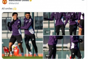 曼联官方更新社媒动态,晒出今日的训练照片,库尼亚在列,他露出笑容,看起来伤势问题不大。